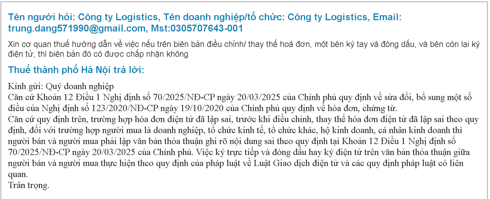- > Công văn số 941/CT-TTHT: Trường hợp hóa đơn đã lập và gửi cho người mua, đã giao hàng hóa, cung ứng dịch vụ, người bán và người mua đã kê khai thuế, sau đó phát hiện sai sót thì người bán và người mua phải lập văn bản thỏa thuận có chữ ký điện tử của cả hai bên ghi rõ sai sót hoặc người bán và người mua phải lập biên bản giấy hoặc có thỏa thuận bằng văn bản giấy ghi rõ sai sót, đồng thời người bán lập hóa đơn điện tử điều chỉnh sai sót.