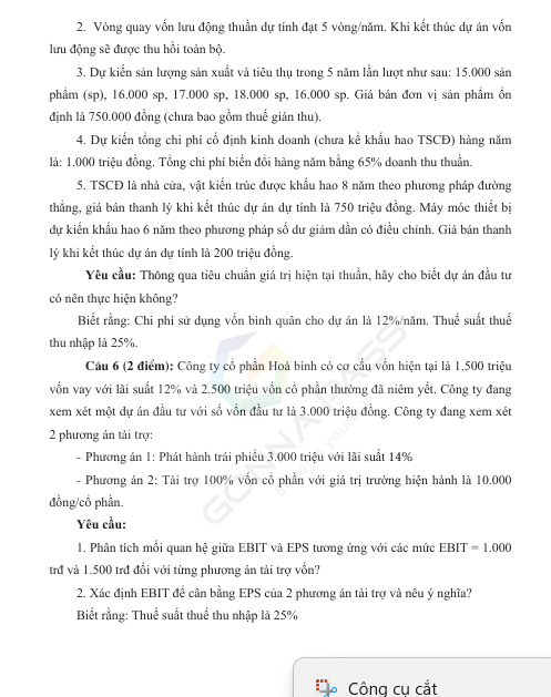 – Phương án 2: Tài trợ 100% vốn cổ phần với giá trị trường hiện hành là 10.000 đồng/cổ phần.