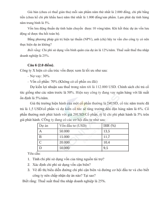 - Tính chi phí sử dụng vốn của từng nguồn tài trợ?