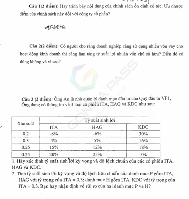 Câu 1 (2 điểm): Hãy trình bày nội dung của chính sách ổn định cổ tức. Ưu nhược điểm của chính sách này đối với công ty cổ phần?