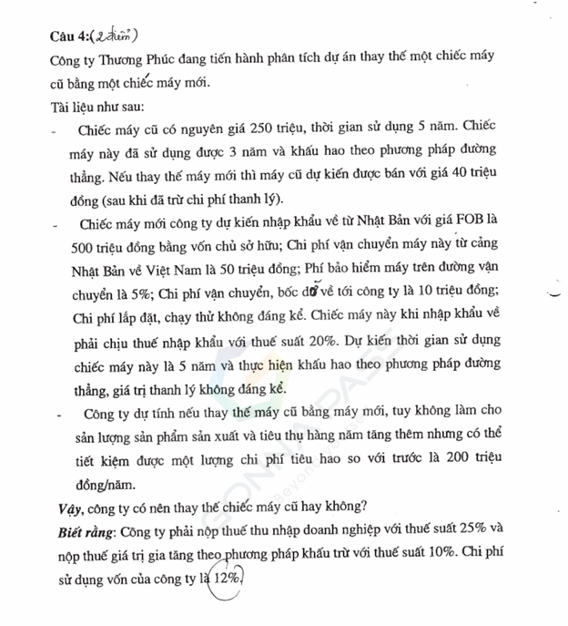 Công ty Thương Phúc đang tiến hành phân tích dự án thay thế một chiếc máy cũ bằng một chiếc máy mới. Tài liệu như sau: