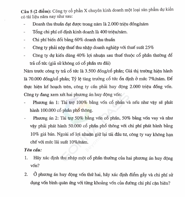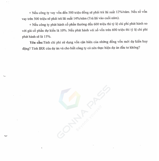 Câu 5 (2 điểm): Công ty X có kết cấu nguồn vốn hiện tại được coi là tối ưu, trong đó vốn vay: 4.000 triệu đồng, vốn cổ phần thường: 6.000 triệu đồng (Không có cổ phần ưu đãi). Năm nay, công ty dự kiến sẽ trả lời cổ tức cho cổ đông thường là 4.000 đồng/cổ phần, tỷ lệ tăng trưởng cổ tức cổ phần thường dự kiến tăng đều đặn hàng năm là 5%. Giá trị thị trường hiện hành của một cổ phần thường là: 35.000 đồng. Dự kiến trong năm, số lợi nhuận sau thuế để lại tái đầu tư là 600 triệu đồng. Giả sử công ty đang có một cơ hội đầu tư với dòng tiền thuần dự kiến là: triệu đồng, triệu đồng, triệu đồng, triệu đồng. Thuế suất thuế thu nhập doanh nghiệp là 25%.