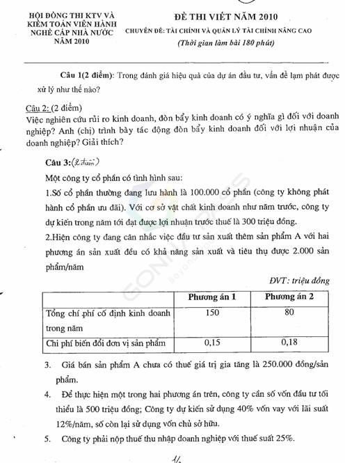 Gonnapass xin gửi lại sưu tầm Đề thi và Đáp án tham khảo môn Tài chính năm 2010 của kỳ thi kế toán và kiểm toán viên Việt Nam (CPA) do Bộ Tài  chính tổ chức để các bạn tự ôn thi.