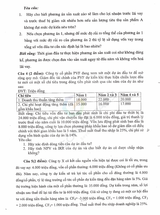 Câu 4 (2 điểm): Công ty cổ phần PVF đang xem xét một dự án đầu tư để mở rộng quy mô. Giám đốc tài chính của PVF dự kiến khi thực hiện chiến lược đầu tư mới có một số chỉ tiêu trong dòng tiền phát sinh qua các năm của dự án như sau: