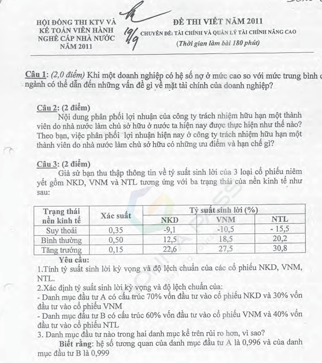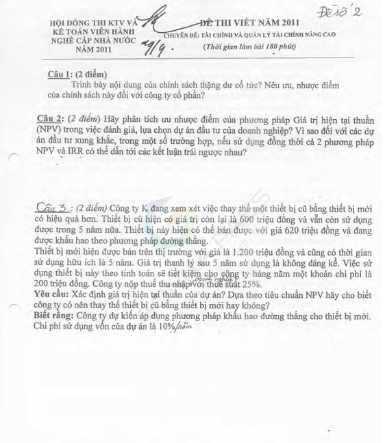 Gonnapass xin gửi lại sưu tầm Đề thi và Đáp án tham khảo môn Tài chính năm 2011 của kỳ thi kế toán và kiểm toán viên Việt Nam (CPA) do Bộ Tài chính tổ chức để các bạn tự ôn thi.