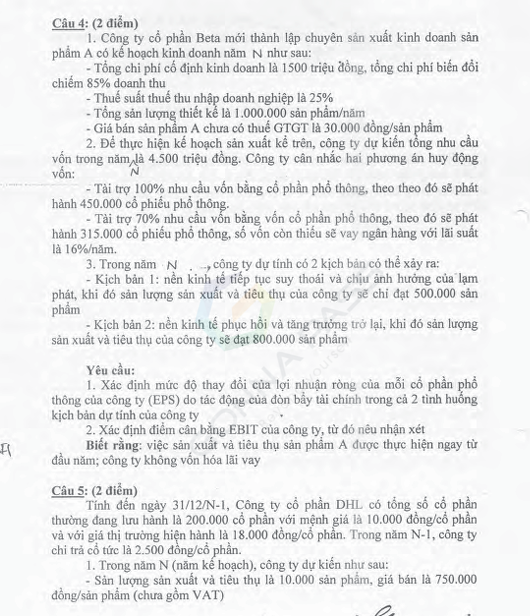 Câu 4 (2 điểm): Công ty cổ phần Beta mới thành lập chuyên sản xuất kinh doanh sản phẩm A có kế hoạch kinh doanh Năm như sau: