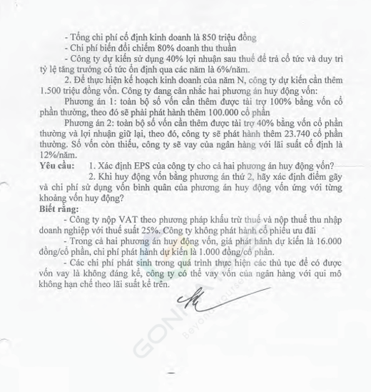 - Phương án 2: toàn bộ số vốn cần thêm được tài trợ 40% bằng vốn cổ phần thường và lợi nhuận giữ lại, theo đó, công ty sẽ phát hành thêm 23.740 cổ phần thường. Số vốn còn thiếu, công ty sẽ vay của ngân hàng với lãi suất cố định là 12%/năm.Yêu cầu: