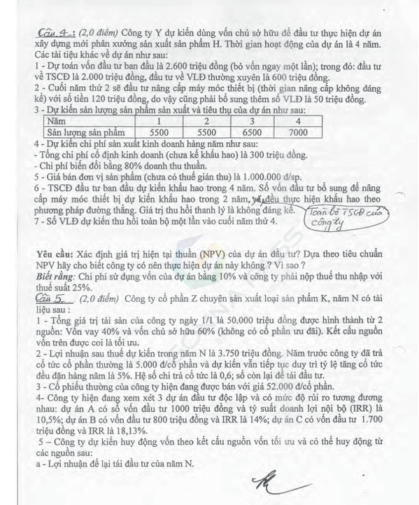 Câu 4 (2,0 điểm): Công ty Y dự kiến dùng vốn chủ sở hữu để đầu tư thực hiện dự án xây dựng mới phân xưởng sản xuất sản phẩm H. Thời gian hoạt động của dự án là 4 năm. Các tài liệu khác về dự án như sau: