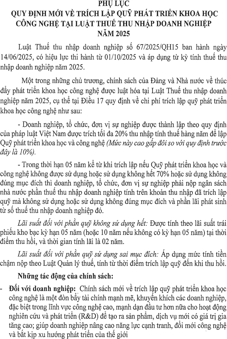Luật 67/2025/QH15 – Quy định mới về trích lập Quỹ phát triển khoa học và công nghệ
