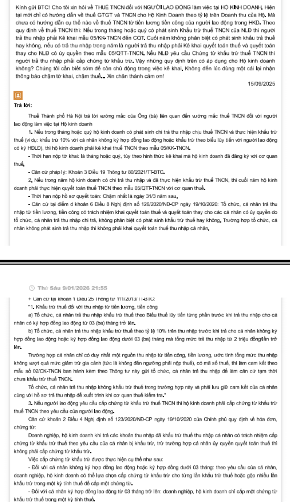 Kính gửi BTC! Cho tôi xin hỏi về THUẾ TNCN đối với NGƯỜI LAO ĐỘNG làm việc tại HỘ KINH DOANH. Hiện tại mới chỉ có hướng dẫn về thuế GTGT và TNCN cho Hộ Kinh Doanh theo tỷ lệ trên Doanh thu của Hộ. Mà chưa có hướng dẫn cụ thể nào về thuế TNCN từ tiền lương tiền công của người lao động trong HKD. Theo quy định về thuế TNCN thì: Nếu trong tháng hoặc quý có phát sinh Khấu trừ thuế TNCN của NLĐ thì người trả thu nhập phải Kê khai mẫu 05/KK-TNCN đến CQT. Cuối năm không phân biệt có phát sinh khấu trả thuế hay không, nếu có trả thu nhập trong năm là người trả thu nhập phải Kê khai quyết toán thuế và quyết toán thay cho NLĐ có ủy quyền theo mẫu 05/QTT-TNCN. Nếu NLĐ yêu cầu Chứng từ khấu trừ thuế TNCN thì người trả thu nhập phải cấp chứng từ khấu trừ. Vậy những quy định trên có áp dụng cho Hộ kinh doanh không? Chúng tôi cần biết sớm để còn chủ động trong việc kê khai. Không đến lúc đùng một cái lại nhận thông báo chậm tờ khai, chậm thuế… Xin chân thành cảm ơn!