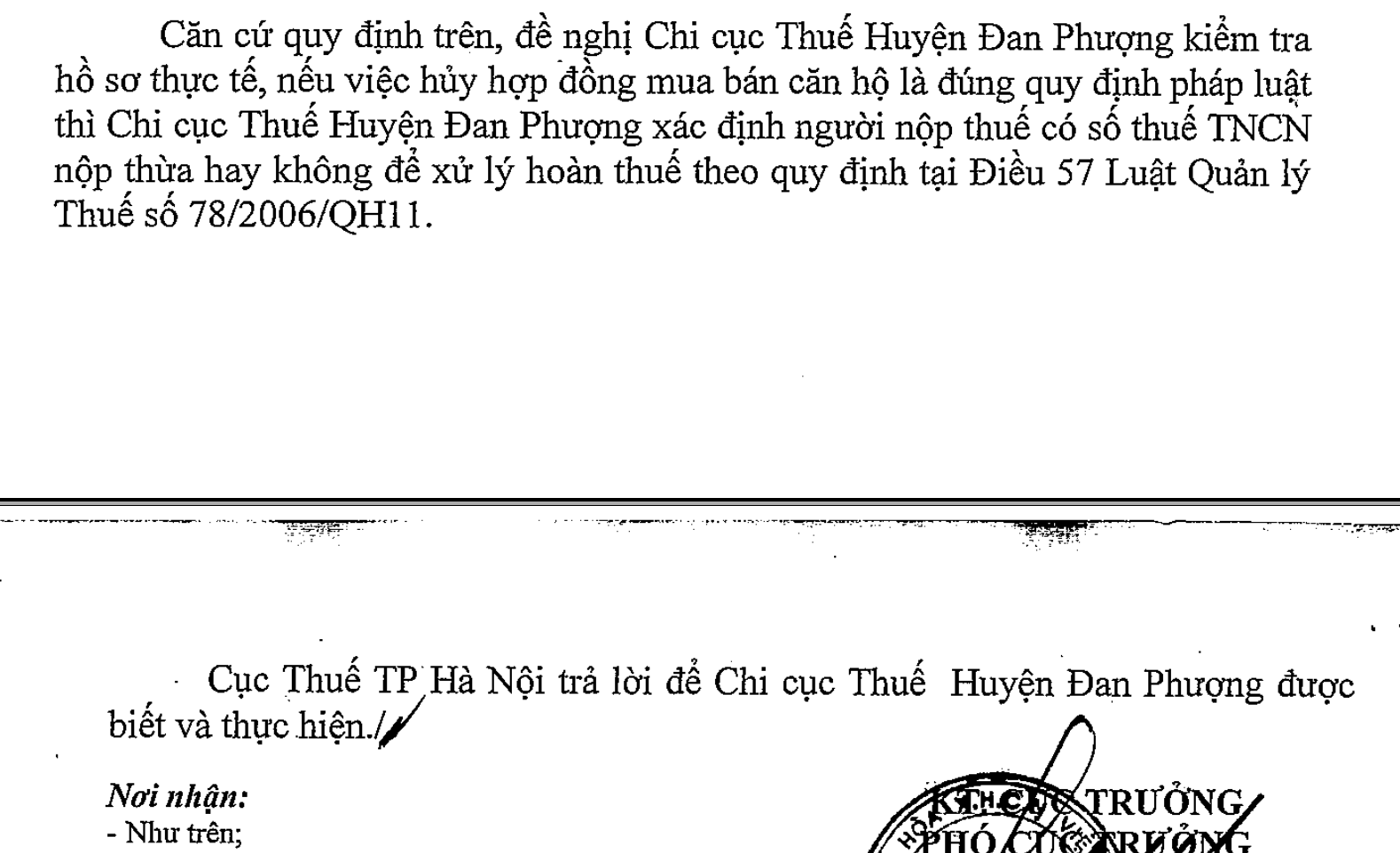 Trong thực tế, nhiều cá nhân đã nộp thuế TNCN khi ký hợp đồng chuyển nhượng căn hộ, nhưng sau đó hai bên thỏa thuận hủy hợp đồng. Dựa trên Công văn số 4098/CT-TTHT của Cục Thuế TP Hà Nội, hướng dẫn giải quyết như sau: