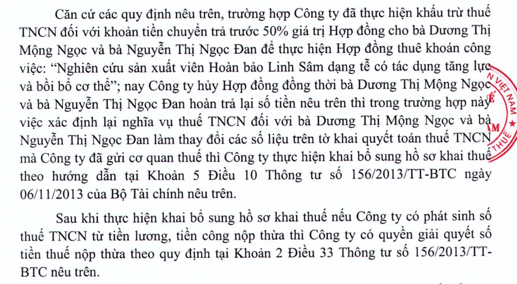 • Doanh nghiệp đã tạm ứng trước tiền cho cá nhân để thực hiện hợp đồng (ví dụ: nghiên cứu sản xuất) và đã thực hiện khấu trừ thuế TNCN trên khoản tạm ứng nàySau đó, doanh nghiệp hủy hợp đồng và cá nhân hoàn trả lại số tiền tạm ứng cho doanh nghiệp.