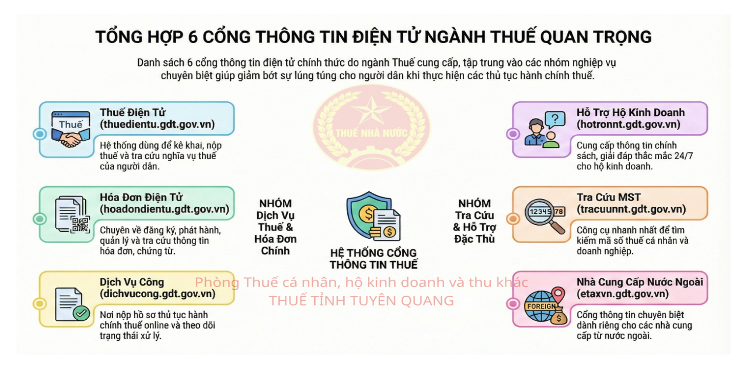 Tổng hợp 6 cổng thông tin điện tử của ngành thuế đang được sử dụng phổ biến, giúp kê khai, nộp thuế và tra cứu thông tin thuận lợi trong giai đoạn hiện nay như sau: