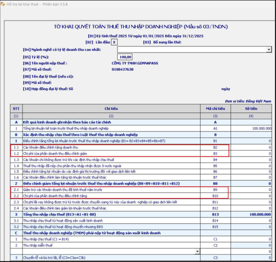 | Năm 2025 ghi nhận | (Kê khai chỉ tiêu B3, B9 – Tờ khai QTT) | Nếu áp dụng thông tư 200/2014/TT-BTC