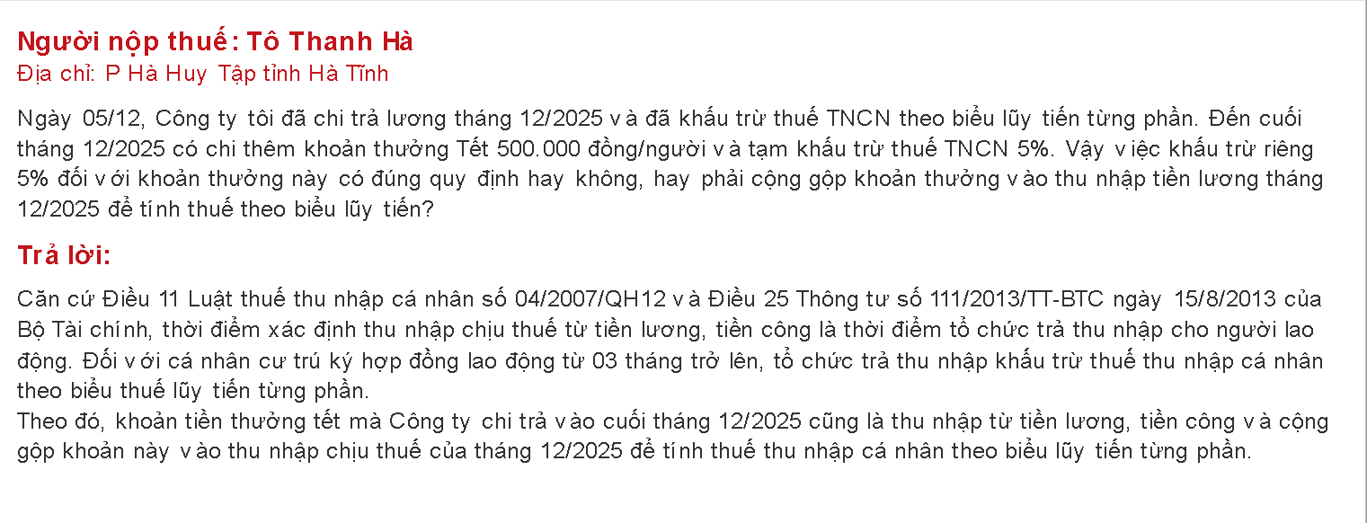 Therefore, if the company temporarily does not deduct the PIT bonus for Tet and aggregate it once into the PIT finalization at the end of the year and calculate and pay the tax, there is a risk that