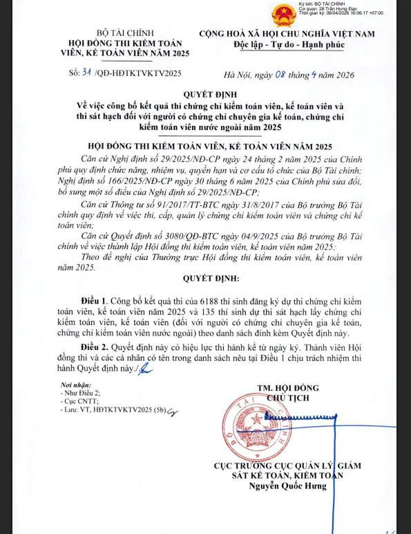 Về việc công bố kết quả thi Kiểm toán viên, Kế toán viên và thi sát hạch người có chứng chỉ chuyên gia kế toán, chứng chỉ kiểm toán viên nước ngoài năm 2025