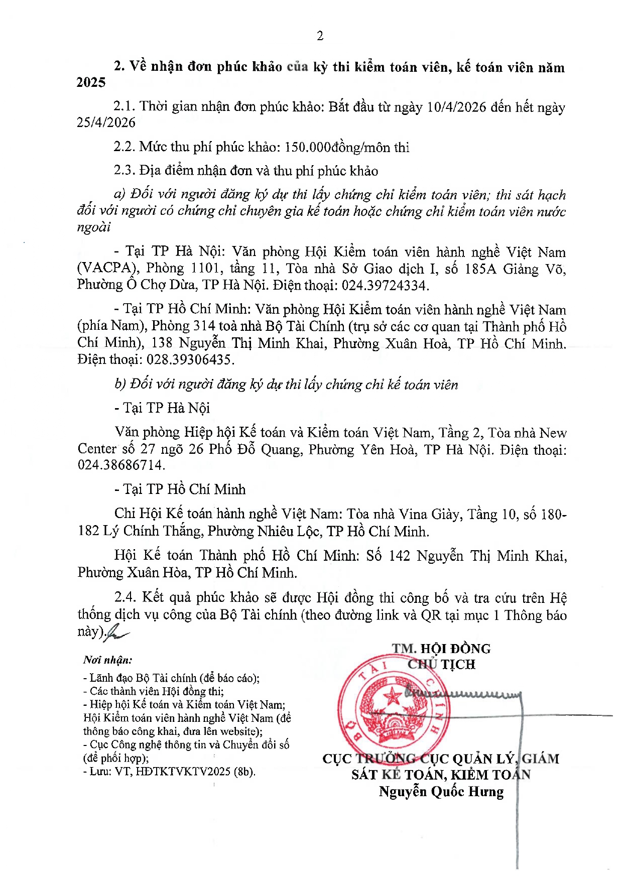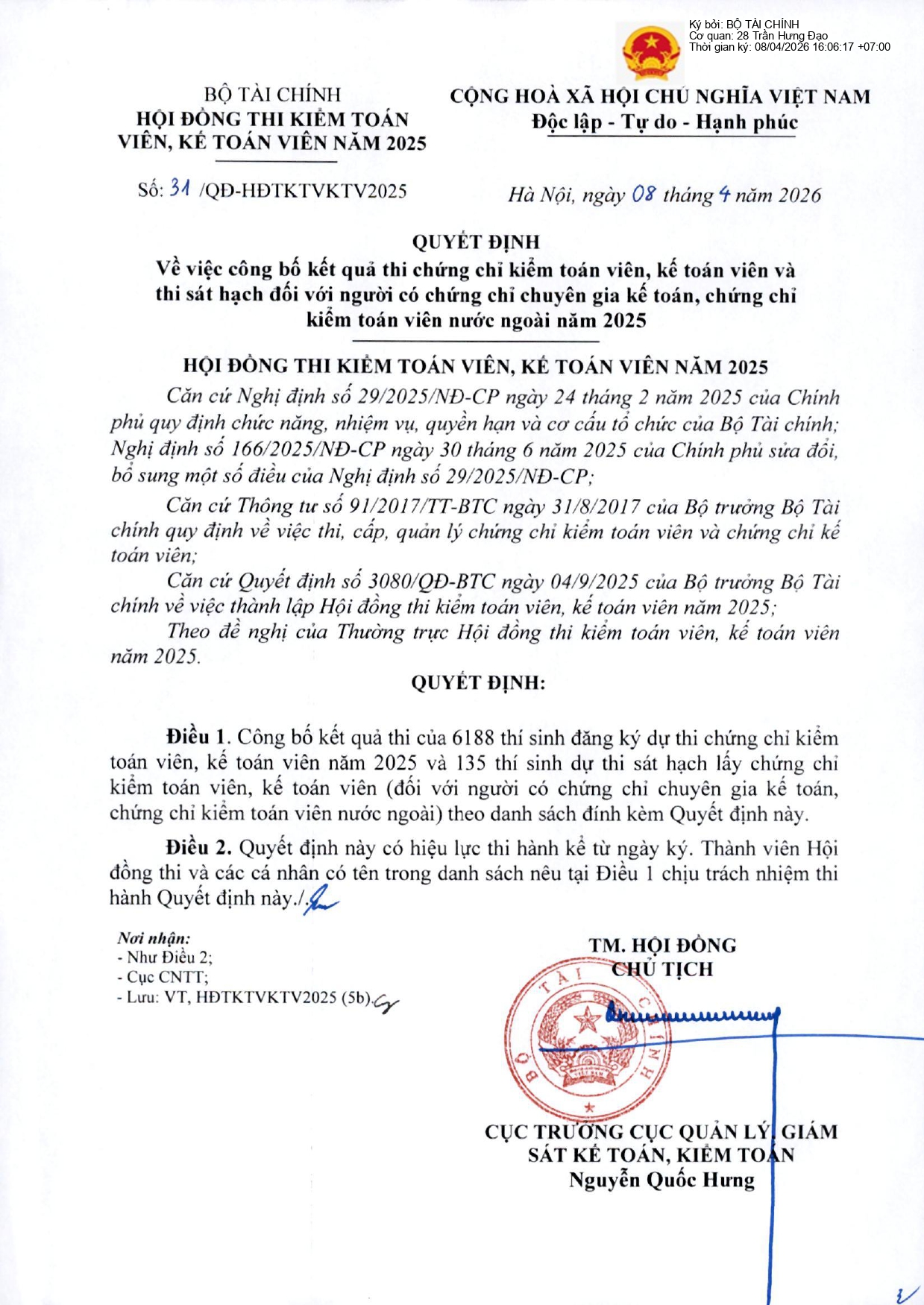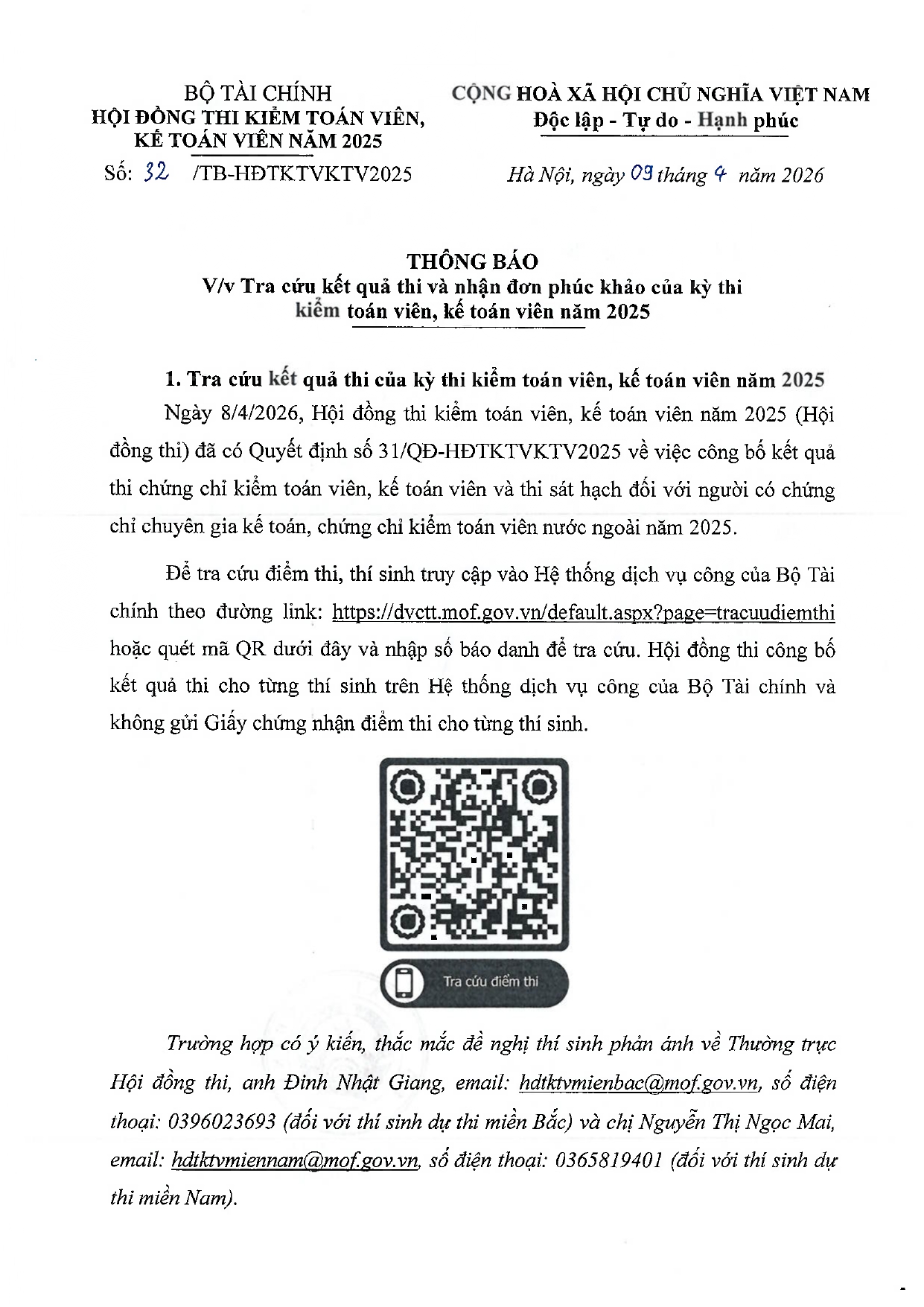Về việc công bố kết quả thi Kiểm toán viên, Kế toán viên và thi sát hạch người có chứng chỉ chuyên gia kế toán, chứng chỉ kiểm toán viên nước ngoài (Điểm thi CPA 2025)