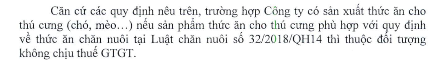 Như vậy, trường hợp Công ty có sản xuất thức ăn cho thú cưng (chó, mèo…) nếu sản phẩm thức ăn cho thú cưng phù hợp với quy định về thức ăn chăn nuôi tại Luật chăn nuôi số 32/2018/QH14 thì thuộc đối tượng không chịu thuế GTGT.