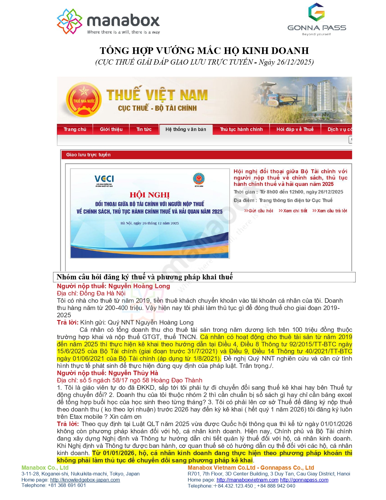 | 3) 01/01/2026 bỏ thuế khoán – chuyển sang kê khai: thủ tục, sổ sách, lựa chọn cách tính | HKD đang khoán chuyển kê khai; nhóm 2/3; có phải tự đi “chuyển đổi” không; mẫu sổ sách gì; có phải nộp tờ khai đăng ký tính theo DT hay LN? | Trả lời đính kèm thiên về: từ 01/01/2026 không còn phương pháp khoán; cơ quan thuế sẽ hướng dẫn khi Nghị định/Thông tư ban hành; HKD khoán không phải làm thủ tục riêng để chuyển (theo nội dung trả lời). |