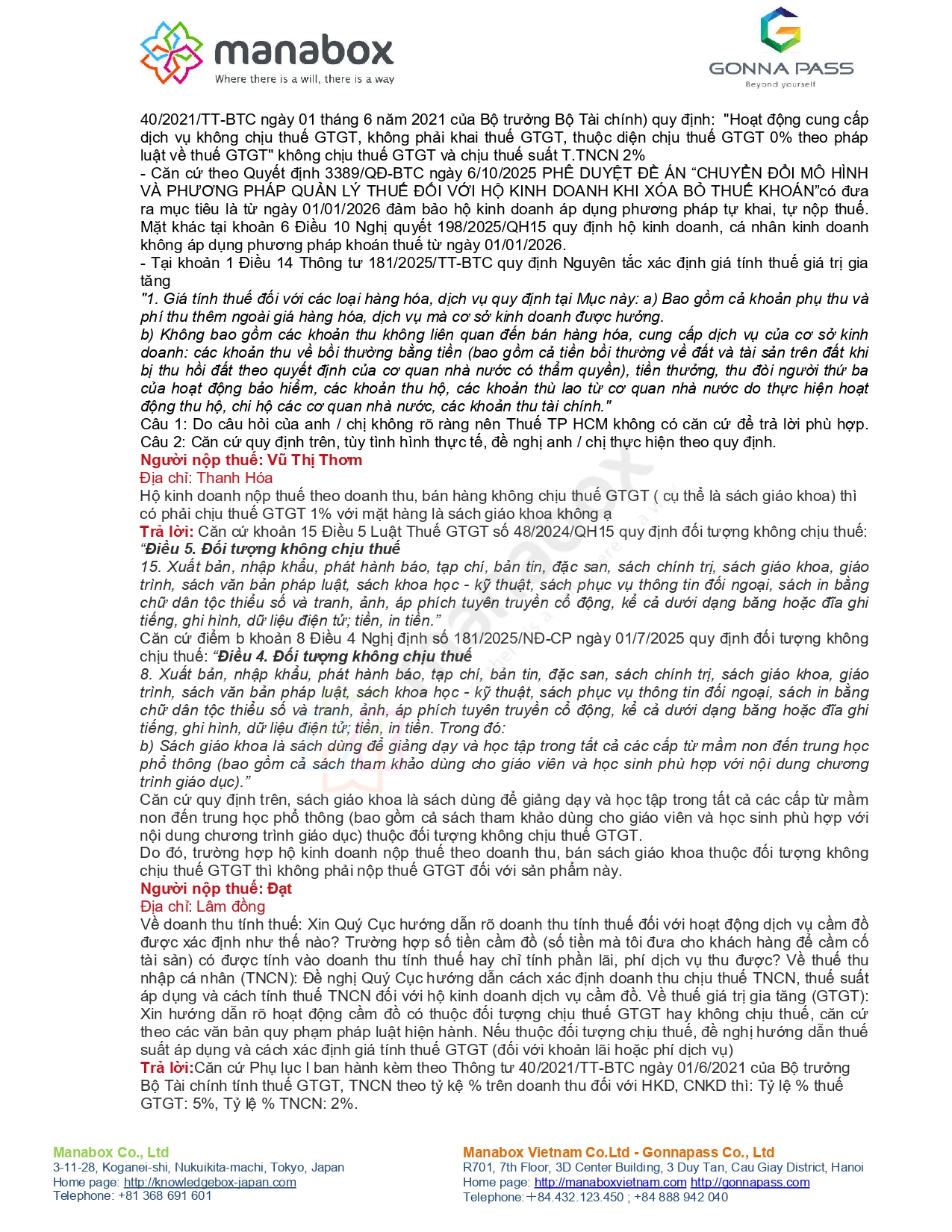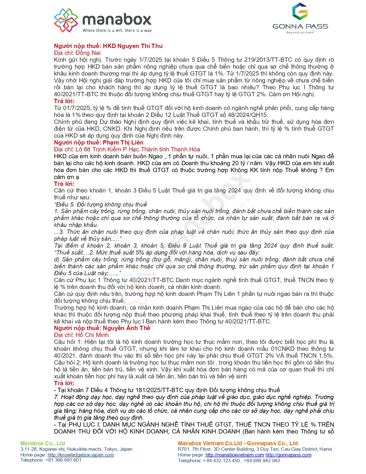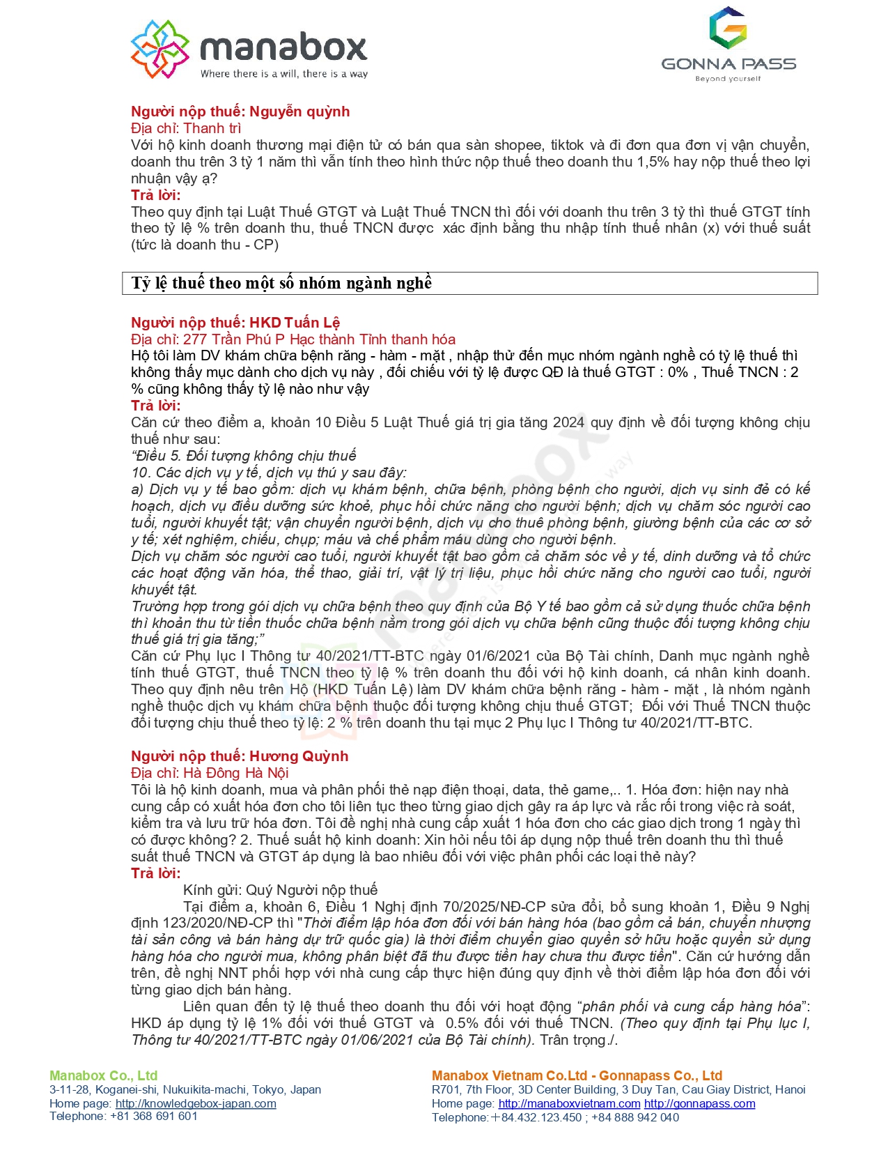 | 11) Thuế suất theo ngành nghề đặc thù (phụ lục tỷ lệ %/đối tượng không chịu thuế) | Cầm đồ; Youtube; y tế nha khoa; sách giáo khoa; nông sản sơ chế; ngao tự nuôi vs mua bán; giáo dục mầm non; trang trại nấm; vận chuyển xe ba gác… | Trả lời rải rác theo từng case, nhưng điểm chung: xác định đúng bản chất hoạt động để áp tỷ lệ/đối tượng không chịu thuế; nhiều câu viện dẫn Phụ lục I TT40 và/hoặc Luật Thuế GTGT 2024. |