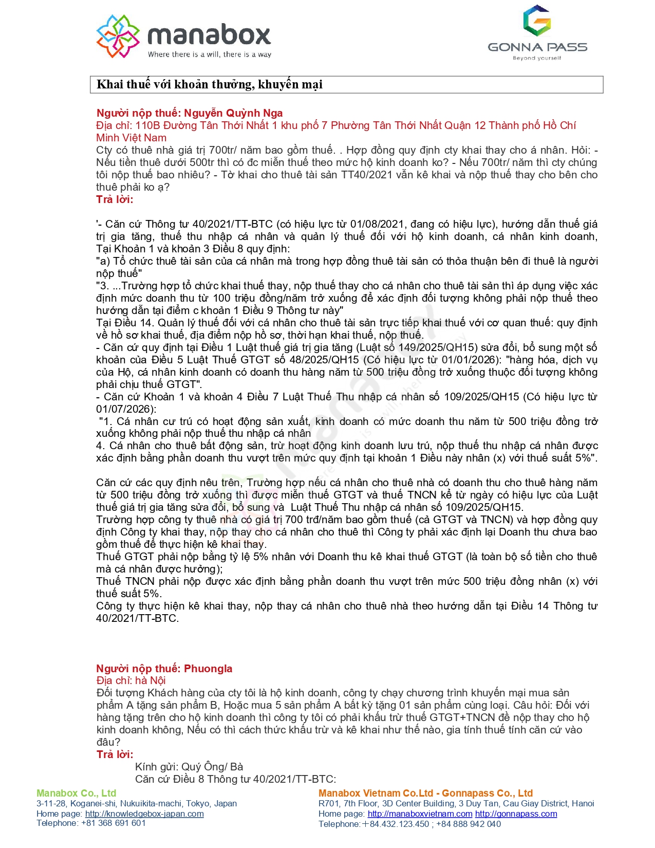 | 8) Cho thuê tài sản/nhà: có phải lập HKD không, kê khai theo kỳ nào, có quyết toán chung với lương không | Có bắt buộc lập HKD hay chỉ đăng ký MST và nộp tờ khai? khai theo kỳ thanh toán; DN thuê khai thay; cho thuê + lương có quyết toán chung không | Trả lời trong file: căn cứ NĐ 168/2025 về quyền thành lập HKD: có quyền lập HKD; nếu không lập HKD thì đăng ký thuế trực tiếp theo TT 86/2024. Thu nhập cho thuê tài sản không quyết toán chung với tiền lương (một Q&A trả lời thẳng). DN thuê khai thay thực hiện theo TT 40/2021. |