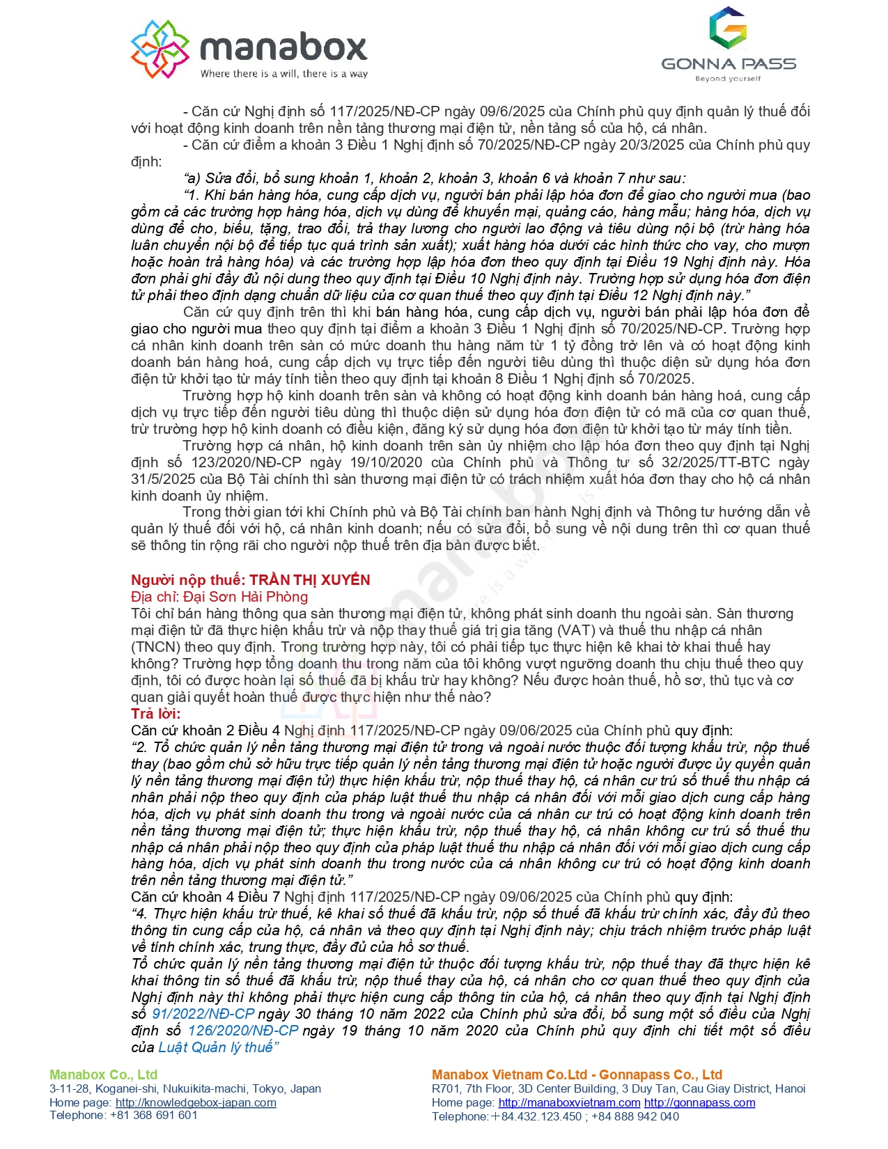 | 1) TMĐT – sàn đã khấu trừ/nộp thay: có phải kê khai, nộp thêm, quyết toán? | Bán trên Shopee/Tiktok/Etsy… sàn đã khấu trừ VAT+TNCN; lo “nộp 2 lần”; doanh thu lớn (≥1 tỷ, ≥3 tỷ); có cần quyết toán TNCN theo “doanh thu – chi phí”? | Trả lời trong file có 2 mảng: (i) nhiều câu “chờ Nghị định/Thông tư 2026” theo Luật QLT 108/2025 & Luật TNCN 109/2025; (ii) với sàn thuộc diện khấu trừ nộp thay theo NĐ 117/2025, nếu chỉ có doanh thu qua sàn và sàn đã khấu trừ/kê khai/nộp thay thì không phải tự kê khai GTGT/TNCN cho phần đó; có cơ chế hoàn nếu doanh thu năm thuộc diện không chịu thuế nhưng đã bị khấu trừ. |